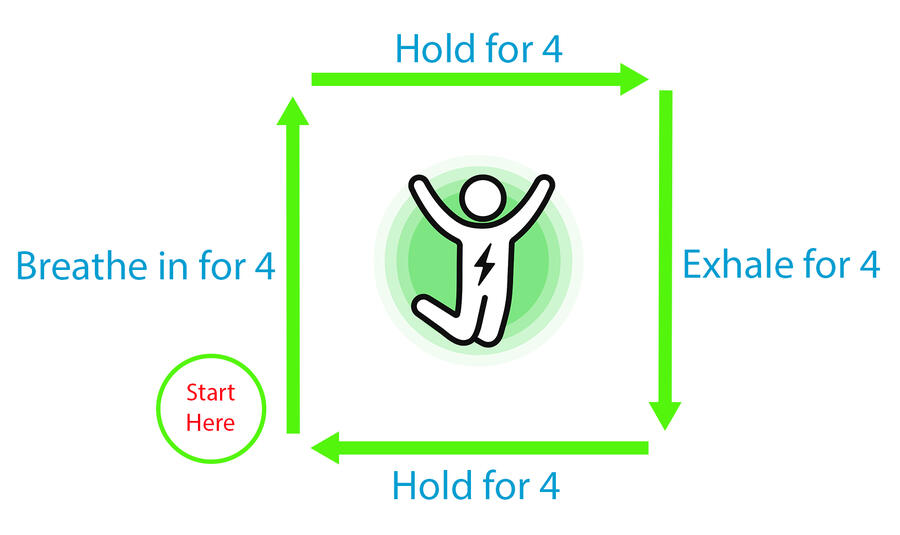 Breath work is one of the simplest and most efficient ways to lower our heart rate and reduce stress/anxiety by slowing things down. You want to try and make sure your breaths are coming from your diaphragm (so your belly extends when breathing in) as opposed to only your chest. You can imagine following these 4 steps like the sides of a square. 1) Breathe in over 4 seconds 2) Hold for 4 seconds 3) Exhale over 4 seconds 4) Hold for 4 seconds The duration of each step can be lengthened or shortened as preferred and repeated until you are out of time or feel an improvement.